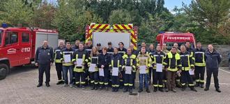 Nachdem alle Teilnehmer die praktische und schriftliche Lernerfolgskontrolle mit Erfolg abgelegt hatten, wurden ihnen durch den Brand- und Katastrophenschutzinspekteur (BKI) Markus Keppler die Ausbildungsnachweise überreicht.