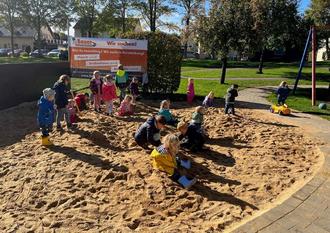 Startklar mit Matschhosen und Schaufeln konnten nun auch die Kinder ihr Bestes geben. Fleißig halfen sie, den Sand gleichmäßig zu verteilen und freuen sich seitdem täglich, genügend Platz zum Schaufeln, Sandburgen bauen und „Kuchen backen“ zu haben.