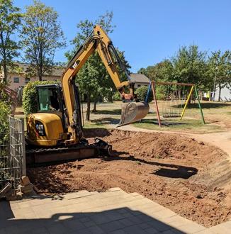 In Zusammenarbeit mit Uwe Klassen, Vater im Elternausschuss und Andre Müller, Hausmeister der Kita, wurde als erstes großzügig ausgebaggert, der Mutterboden entsorgt und auch die Randsteine neu befestigt. Durch eine weitere Spende der Firma Henrich aus Gerolstein wurde ein Unkrautvlies ausgelegt und der Sandkasten konnte unter Aufsicht vieler erwartungsvoller Kinderaugen mit Sand gefüllt werden. Am Schluss wurde der angrenzende Zaun mit Siebdruckplatten verschlossen, damit im Alltag der Sand auch da bleibt, wo er hin gehört.