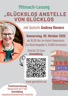 Andrea Revers verrät uns in der Mitmach-Lesung, wie wir mit Strategien unser Wohlbefinden steigern können. Im anschließenden Dialog können wir mit einfachen Übungen vielleicht unser eigenes Glückslos finden. Eine Veranstaltung für alle. Termin: Donnerstag, 30.10.2025 ab 18:30 Uhr im Hotel Löwenstein, Zur Büschkapelle 5, 54568 Gerolstein. Der Zugang ist barrierefrei. Der Kostenbeitrag beträgt 12 Euro. Um Anmeldung wird gebeten per E-Mail an sekretariat@gerolstein.de. Auf Wunsch kann vor dem Vortrag ab 17:00 Uhr im Hotel gegessen werden. Anmeldung per E-Mail an: rezeption@loewenstein-hotel.de.