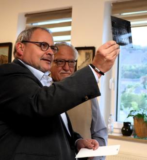 Stadtbürgermeister Uwe Schneider und Rainer Nowotny (v.l.) bei der Übergabe der Fotosammlung im Stadtarchiv.