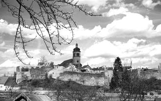 Ansicht auf Hillesheim mit Stadtmauer und Kirche (1962)