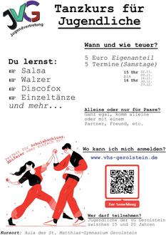 In Kooperation zwischen der VHS und der Jugendvertretung findet wieder ein Tanzkurs für Jugendliche statt – und es gibt noch ein paar freie Plätze. Hier kannst Du viele klassische Paartänze wie Walzer, Salsa, Discofox und Bachata lernen. Neben den Paartänzen lernst du auch Tänze, die man allein oder in der Gruppe tanzen kann. Die Kurse finden in Zusammenarbeit mit der Jugendvertretung der VG Gerolstein statt. Bei Interesse oder Fragen könnt ihr euch gerne an die Jugendvertretung wenden über Instagram @jugendvertretunggerolstein oder jugendvertretung@gerolstein.de.