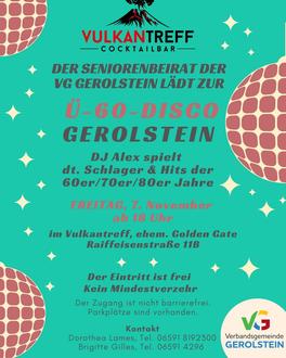 Der Seniorenbeirat lädt am Freitag, 7. November 2025 wieder zur beliebten Ü-60-Disco ein. "Der Vulkantreff ist immer gut besucht. Bei leckeren Cocktails wird viel getanzt und neue Bekanntschaften werden geschlossen“, erzählt Organisatorin Dorothea und wünscht viel Spaß!