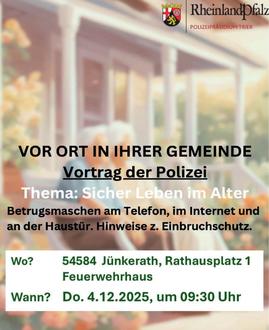 Im Rahmen des Kursangebotes „Digitales im Alter“ wird auch das Thema „Betrugsmaschen am Telefon und im Internet“ behandelt. Ralph Schoppet vom Zentrum Polizeiliche Prävention des Polizeipräsidiums Trier hält dazu einen Vortrag am 4. Dezember 2025 von 09:30 bis 12:00 Uhr im Feuerwehrhaus in Jünkerath. Er geht darauf ein, wie Täter vorgehen und was zu tun ist, wenn ein Betrugsfall eintritt. Weiterhin informiert er über die Gefahren an der Haustür, am Telefon, im Internet und unterwegs. Tipps zum Thema Einbruchschutz- und Vorsorge ergänzen den Vortrag. Neben den Kursteilnehmern sind auch interessierte Bürger zu diesem Vortrag herzlich eingeladen. Eine Voranmeldung ist nicht erforderlich. Weitere Informationen können bei Rainer Helfen, Kursleitung, unter Tel. 06597 4238 oder per E-Mail an rainer.helfen@icloud.com angefragt werden.