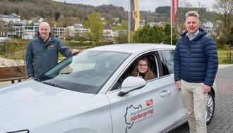 Ralph Paulus, Geschäftsführer auto motor und sport Fahrsicherheitszentrum am Nürburgring GmbH & Co.KG, Trainingsteilnehmerin Annika Lenzen und Bürgermeister Hans Peter Böffgen (v.l.)