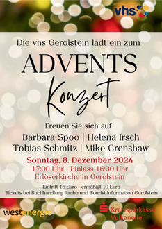 Zu ihrem traditionellen Adventskonzert am Sonntag, 8. Dezember 2024 in der Erlöserkirche in Gerolstein hat die vhs Gerolstein auch in diesem Jahr wieder großartige Musiker gewinnen können: Barbara Spoo (Gesang), Tobias Schmitz (Piano), Helena Irsch (Gesang) und Mike Crenshaw (Gitarre) werden mit traditionellen Weihnachtsliedern, modernen Popsongs und stimmungsvollen Balladen auf die schönste Zeit des Jahres einstimmen.