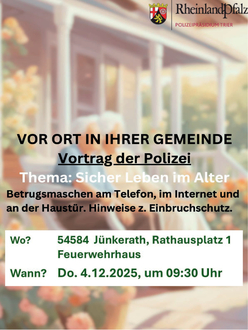 Im Rahmen des Kursangebotes „Digitales im Alter“ wird auch das Thema „Betrugsmaschen am Telefon und im Internet“ behandelt. Ralph Schoppet vom Zentrum Polizeiliche Prävention des Polizeipräsidiums Trier hält dazu einen Vortrag am 4. Dezember 2025 von 09:30 bis 12:00 Uhr im Feuerwehrhaus in Jünkerath. Er geht darauf ein, wie Täter vorgehen und was zu tun ist, wenn ein Betrugsfall eintritt. Weiterhin informiert er über die Gefahren an der Haustür, am Telefon, im Internet und unterwegs. Tipps zum Thema Einbruchschutz- und Vorsorge ergänzen den Vortrag. Neben den Kursteilnehmern sind auch interessierte Bürger zu diesem Vortrag herzlich eingeladen. Eine Voranmeldung ist nicht erforderlich. Weitere Informationen können bei Rainer Helfen, Kursleitung, unter Tel. 06597 4238 oder per E-Mail an rainer.helfen@icloud.com angefragt werden.