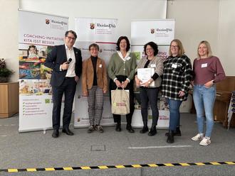 Gesundheitsförderliche und nachhaltige Ernährung beginnt im Alltag: Als Kita tragen wir mit den Familien gemeinsam Verantwortung dafür. Mit einem durchdachten Verpflegungskonzept und gezielten Maßnahmen der Ernährungsbildung lassen sich wichtige Grundlagen für ein langfristig gesundes Essverhalten schaffen. Aus diesem Grund haben wir uns für eine Teilnahme an der Coaching-Initiative „Kita isst besser“ des Ministeriums für Klimaschutz, Umwelt, Energie und Mobilität RLP beworben. Am 18.11.2025 fand am Dienstleistungszentrum Ländlicher Raum Rheinhessen-Nahe-Hunsrück in Bad Kreuznach die Auftakt- und Bilanzveranstaltung statt. Gemeinsam mit Ute Rölen unserer Fachberatung für Kindertagesstätten (KV Vulkaneifel) sind wir mit drei Vertreterinnen der Kita nach Bad Kreuznach gereist. Umweltstaatssekretär Michael Hauer überreichte uns die Benennungsurkunde für die Coaching-Runde 2026-2027. Mit wichtigen Informationen und wertvollen Impulse gespeist, freuen wir uns, mit dem Coaching zu starten.