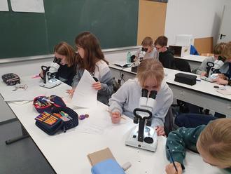 Am 9., 11. und 13.12.2024 fanden Projekttage für die 5. Klassen im Fach Naturwissenschaften statt. Das Geopark-Team führte mit den drei Klassen jeweils ein eintägiges Programm zum Thema „Einführung in das Mikroskopieren mit Hilfe von Steinen und Mineralien“ durch. Nachdem die Experten den Aufbau des Mikroskops erklärt hatten, wurden Steine, Kristalle und Sand mikroskopiert. Anschließend erhielten die Schülerinnen und Schüler die Aufgabe, verschiedenste Gesteine, Vulkanschlacken und Mineralien ausschließlich durch Tasten mit Hilfe von Fühlsäcken zu beschreiben.