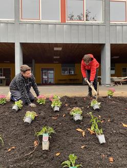 Im Frühjahr werden noch weitere Pflanzen eingesetzt, um das ganze Jahr über eine Blütenpracht zu gewährleisten. Zudem wird dann das Hochbeet mit Küchenkräutern für das gesunde Pausenfrühstück bestückt.