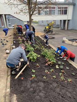 Über 73 Freiwillige meldeten sich, um nach den Bagger- und Aushubarbeiten die Pflanzgestaltung des großen Pausenhofes des Sankt-Matthias-Gymnasiums in Angriff zu nehmen. An drei Tagen engagierten sich viele Eltern, Lehrkräfte, der Hausmeister, die Sekretärinnen, Mitglieder der Schülervertretung und Kinder, wodurch das Bepflanzen der Beete, das Setzen der Bäume und Beerensträucher, das Anfertigen eines Hochbeetes, das Pflasterverlegen und das Setzen von über 100 Heckenpflanzen zügig und mit Freude umgesetzt werden konnte. Helfende Eltern sorgten auch für eine hervorragende Verpflegung, sodass die Schulgemeinschaft in diesem Projekt tatkräftig zusammenarbeitete.