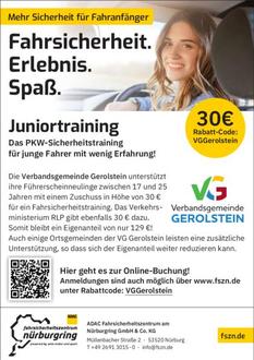 Die Kursgebühr ab 1. Januar 2026 beträgt 189 Euro. Die Verbandsgemeinde Gerolstein unterstützt die Trainings für junge Fahrer/innen im Alter zwischen 17 und 25 Jahren mit einem Zuschuss in Höhe von 30 Euro. Das Land Rheinland-Pfalz gibt ebenfalls 30 Euro dazu. Bei Inanspruchnahme dieser Vergünstigungen bleibt für die Jugendlichen somit ein Eigenanteil von 129 Euro. Auch einige Ortsgemeinden (zum Beispiel Nohn, siehe Hinweis in dieser Ausgabe) leisten eine Unterstützung, so dass der Eigenanteil weiter sinkt. Die Zuschüsse der Ortsgemeinden sind unter Vorlage der Teilnahmebescheinigung über den/die jeweilige/n Orts-/Stadtbürgermeister/in abzurechnen. Anmeldung über www.fszn.de oder Tel. 02691 3015-0 mit dem Rabattcode VG Gerolstein. Die Zuschüsse der Verbandsgemeinde und des Landes werden bei der Anmeldung mit den Kosten verrechnet – ein unkompliziertes Verfahren für die Teilnehmer. Bei Fragen: Verbandsgemeindeverwaltung Gerolstein, Helga Lützen, E-Mail sekretariat@gerolstein.de, Tel. 06591 13-1001.