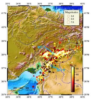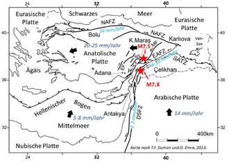 Die Türkei ist von Plattengrenzen umgeben und daher stark erdbebengefährdet. Die verheerenden Erdbeben am 6. Februar ereigneten sich auf der Ostanatolischen Störungszone, und zwar sowohl auf dem Hauptstrang, als auch auf dem nördlichen Strang, was sich auch in der Nachbebenverteilung abzeichnet. Bei den Beben gab es auf den Bruchflächen bis zu 10 m Versatz.