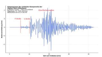Schwedenschanze in über 2800 km Entfernung registriert. Hier dargestellt ist die Vertikalkomponente der Registrierung des Hauptbebens, das über 30 Minuten lang die Erde in Hillesheim zum Schwingen brachte und dabei einen maximalen Ausschlag von 2,5 mm verursachte.