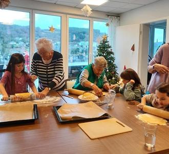 Einige unserer Kita-Kinder besuchen alle 14 Tage ihre lieben Nachbarn der Gero-WG-Wohngruppe. Im Gemeinschaftsraum treffen wir uns und spielen, malen, singen, backen und erzählen miteinander. Inzwischen sind schon richtige Beziehungen untereinander entstanden und alle Beteiligten freuen sich auf unseren gemeinsamen Donnerstag. Natürlich laden wir unsere lieb gewonnenen Nachbarn auch zu uns ein. So konnten wir das St. Martins-Fest gemeinsam erleben und auch den Weiberdonnerstag werden wir zusammen feiern. Wir freuen uns auf viele weitere Treffen.