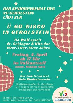 Am Freitag, 4. April lädt der Seniorenbeirat zur ersten Ü-60-Party in der Verbandsgemeinde ein. Alle Tanzfreudigen plus 60 können ab 17 Uhr bei deutschen Hits und Schlagern der 60er, 70er und 80er Jahre im Vulkantreff (ehemals Golden Gate) ihrer Leidenschaft frönen. Der Eintritt ist frei, Getränke sind kostenpflichtig (kein Mindestverzehr). Der Zugang ist nicht barrierefrei. Parkplätze sind vorhanden. Der Seniorenbeirat freut sich über viele Gäste.