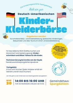 Der Eltern-und Förderverein der Kita Spangdahlem lädt zur Deutsch-Amerikanischen Kinderkleiderbörse am 30.03.2025 von 14 bis 16 Uhr ins Gemeindehaus Spangdahlem ein. Einlass für Schwangere 13 Uhr.