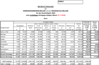 Gemäß § 32 Abs. 2 Landesfinanzausgleichsgesetz (LFAG), in der aktuellen Fassung, erhebt die Verbandsgemeinde von allen Ortsgemeinden und der Stadt Speicher, außer der Ortsgemeinde Orenhofen, eine Grundschulumlage. Der Umlagesatz wird auf 8,19166 v. H. festgesetzt. Die Höhe der Grundschulumlage wird nach der als Anlage 1 beigefügten Berechnung auf 777.800 € festgesetzt.
