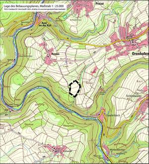 Das künftige Plangebiet befindet sich süd-westlich der bebauten Ortslage von Orenhofen (ca. 1,1 km Entfernung). Im Norden wie im Westen grenzt das Plangebiet an landwirtschaftlich genutzte Flächen bzw. vereinzelte Gehölzstrukturen. Vom Westen bis Süden wird es durch die bewaldeten Hangflächen des Kylltals begrenzt, vom Süden bis Osten durch den Schulersgraben und dessen Gehölzstrukturen. Der Geltungsbereich des Bebauungsplanes umfasst mit einer Größe von ca. 7,8 ha folgende Grundstücke: