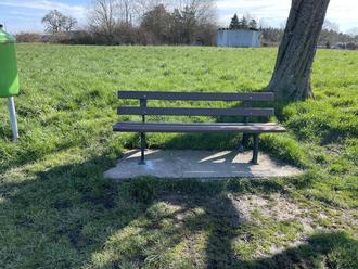 Diese Ruhebank, im fußläufigen Bereich des Alten- und Pflegeheims Marienhof, ist im Laufe der Jahre stark verwittert, wodurch die Nutzung nur noch sehr eingeschränkt möglich war. Die Bankauflage wurde durch Helfer des Eifelvereins erneuert und besteht jetzt aus Recyclingmaterial welches weniger anfällig für Witterungseinflüsse ist.