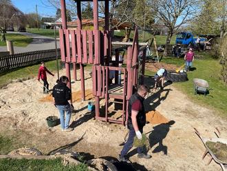 Nun konnten gemeinsam Sand und Rindenmulch ausgetauscht sowie Unkraut entfernt werden. Zudem wurden notwendige Reparaturen und Instandsetzungsarbeiten durchgeführt und der Spielplatz für die neue Spielplatzsaison vorbereitet.