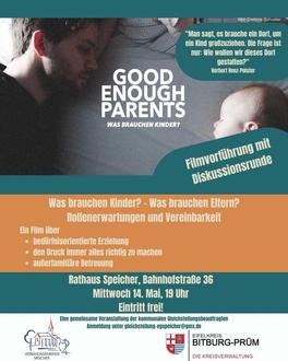 Der Film Good enough parents“ gibt den Fragen Raum „Was brauchen Kinder? Was brauchen Eltern?“. In dem persönlichen Dokumentarfilm nimmt der Regisseur Domenik Schuster die Irrungen und Wirrungen seiner eigenen Vaterschaft zum Anlass, sich mit Erziehungsmythen und vermeintlichen Ratschlägen darüber, was Kinder wirklich brauchen, auseinanderzusetzen. Ein Film über bedürfnisorientierte Erziehung und den Druck immer alles richtig machen zu müssen. Aber auch Gleichstellungsthemen werden angesprochen mit Fragen nach der Gestaltung von außerfamiliärer Betreuung. Um Anmeldung wird gebeten unter gleichstellung-vgspeicher@gmx.de