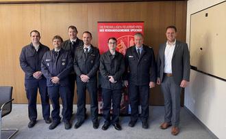 Im Bild von links nach rechts: Stellv. Wehrleiter Marc Meiers, Stellv. Wehrführer Speicher Tim Schilling, Stellv. Wehrführer Orenhofen Michael Heinz, Wehrführer Speicher Alexander Neufang, Wehrführer Orenhofen Jonas Monzel, Wehrleiter Holger Thomsen sowie Bürgermeister Marcus Konrad