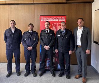 Im Bild von links nach rechts: Stellv. Wehrleiter Marc Meiers, Stellv. Wehrführer Speicher Tim Schilling, Wehrführer Speicher Alexander Neufang, Wehrleiter Holger Thomsen sowie Bürgermeister Marcus Konrad