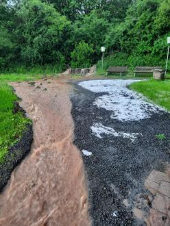 In Preist kam es auch am Stillebach unterhalb der Grillhütte zu schweren Überflutungen. Dort hatte der Bach zeitweise eine Ausdehnung von ca. 30m. Außerdem sind die Grillhütte mit dem Außenbereich und die angrenzenden Wirtschaftswege schwer in Mitleidenschaft gezogen worden. Der Feldweg von Preist nach Orenhofen ist derzeit nicht mehr verkehrssicher und bis auf weiteres für den Verkehr gesperrt. Auch weitere Feldwege auf der Gemarkung haben erhebliche Schäden erlitten. Derzeit sind die Ortsgemeinde und die Verbandsgemeindeverwaltung dabei die Schäden aufzunehmen. Die Ortsgemeinde wird alle Schäden an den Feldwegen beseitigen. Dies wird aber einige zeit in Anspruch nehmen. Wir bitten bereits jetzt alle hierfür um Verständnis.