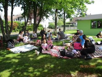Der Naturspielplatz unserer Kita war am Freitagnachmittag vor dem Pfingstwochenende Treffpunkt für Kinder, Eltern und Erzieherinnen aus den Kooperationsgruppen BLAU, GRÜN und ROT. Anlass war eine Einladung zum gemeinsamen Picknick. Es war bereits alles von den Erzieherinnen, den Kindern und dem Küchenteam vorbereitet, als die Eltern eintrafen. Im Gartenhaus war ein Büfett mit Getränken, herzhaften und süßen Leckereien aufgebaut. Mamas und Papas mussten lediglich noch ihre Picknickdecken ausrollen und mit ihren Kindern darauf Platz nehmen.