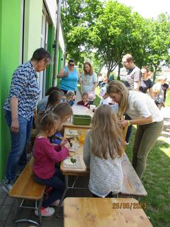 Nach einer kurzen Begrüßung war dann Zeit für einen leckeren Imbiss an der frischen Luft. Nach der ersten Stärkung schwärmten die Kinder aus zum Toben und Spielen. Auf dem „Picknickplatz“ luden auch zwei Workshops zum Blumen sähen und Naturbilder basteln ein. Viele kleine Gärtner füllten jeweils ihren Tontopf mit Blumenerde und drückten Sonnenblumenkerne oder Ringelblumensamen in die Erde. In der Kreativecke entstanden individuelle Salzteigbilder mit gesammelten Schätzen aus der Natur.
