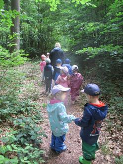 Anfang Juni war es wieder so weit. Mit gepackten Bollerwagen machten sich die Gruppen Blau, Grün und Rot vom Parkplatz aus auf den Weg zu unserem bekannten Waldplatz. Alle Kinder des Trios waren schon ganz freudig aufgeregt, was sie in den nächsten zwei Tagen für spannende Entdeckungen im Wald machen würden. Nach einer kurzen Begrüßungsrunde am Waldsofa konnten sich die Kinder mit Lupen ausstatten und auf Entdeckungsreise gehen. Während die einen es sich erst einmal im Tipi bequem machten, schauten sich andere ganz gespannt die Kaulquappen an, die in einem kleinen Bachlauf langsam zu großen Fröschen heranwachsen. Auch zum Klettern boten sich so viele Möglichkeiten, dass es schon bald Zeit für ein Frühstück zur Stärkung war.