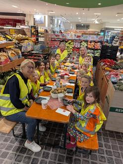 Im REWE-Markt angekommen, erwartete uns bereits mitten in der Obst-/Gemüseabteilung ein reich gedeckter Tisch, diesen hatten die Mitarbeiter vom REWE für uns liebevoll vorbereitet.
