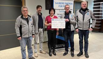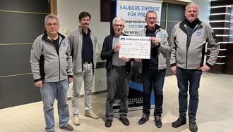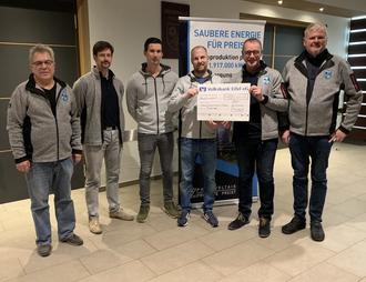 Das Bild zeigt die Übergabe an die Partnerschaftsverein Caudan. Zu sehen sind v.l.n.r. Ortsbürgermeister Dr. Edgar Haubrich, Aufsichtsratsmitglied Stefan Krein, Vorstand des Partnerschaftsverein Rudolf Krein, Vorstand der Photovoltaik Projekte Preist AöR Hans-Peter Schmitz und der 1. Beigeordnete Stefan Willwerding.