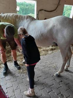 Los ging es am Montag, den 24.07.2023 mit der Fahrt zum Nengshof in Wißmannsdorf. Zunächst konnten die Schüler den Hof erkunden und die verschiedenen Tiere kennen lernen. Dabei standen insbesondere die Pferde an diesem Tag im Mittelpunkt. Die fleißigen Helfer durften die Pferde striegeln und mit Hilfe von Herrn Lenz die Hufe auskratzen. Dabei wurden wichtige Informationen über Pferde, deren Bedürfnisse aber auch über ihre Pflege von Herrn Lenz an die Kinder weitergegeben. Die Grundschüler hatten großen Respekt vor den Pferden, die größer waren als sie selbst. Aber je mehr Zeit mit den Pferden verbracht wurde, umso größer wurde auch das Vertrauen.