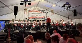 Nach der Messe versammelten sich die Dorfgemeinschaft, der Spielmannszug der FFW Castrop-Rauxel Merklinde, der Musikverein und die Fahnenträger der Vereine vor der Kirche. Durch die Straßen hallten die ersten Trommelschläge und kündigten die Marschmusik an, die uns durch das Dorf zum Festzelt der Freiwilligen Feuerwehr führen sollte. Den musikalischen Auftakt bildete der Auftritt des Spielmannszuges, dessen Pfeifer, Lyren und Trommeln nicht nur traditioneller Marschmusik, sondern auch modernen Stücken einen besonderen Klang verleihen. Eine perfekte Einstimmung für unseren eigenen Auftritt, auf den wir, patriotische Gefühle hegend, lange hingefiebert hatten. Es erfüllt uns mit großem Stolz, und vielleicht auch mit ein wenig Lampenfieber, dass die Herforster jedes Jahr ein Fest auf die Beine stellen, bei dem ein so großes Zelt randvoll mit Menschen gefüllt ist. Doch nicht nur die Anzahl der Menschen, sondern auch die „Qualität“ der Zuschauer sucht ihresgleichen. Es wurde viel geklatscht, gesungen und applaudiert - und wir mittendrin, beflügelt von dieser Atmosphäre.
