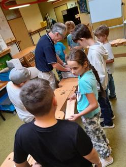 Die Kinder trafen sich am Nachmittag in den Räumlichkeiten der Grundschule Orenhofen, die uns für dieses Projekt freundlicherweise die Räumlichkeiten zur Verfügung gestellt haben. Zunächst lernten sich die Kinder aus den vier verschiedenen Grundschulen durch gemeinsame Spiele kennen und halfen im Anschluss die mobilen Schnitzbänke aufzubauen. Herr Koch erklärte den neugierigen Kindern geduldig die aus Holz selbstangefertigten Werkbänke und ihre fachgerechte Nutzung. Staunend hörten die Kinder Herrn Koch über die Geschichte des Holzes, welches Sie benutzen würden, zu. Auch die vielen verschiedenen Instrumente die zur Verarbeitung des Holzes genutzt werden können wurden erklärt und vorgeführt.