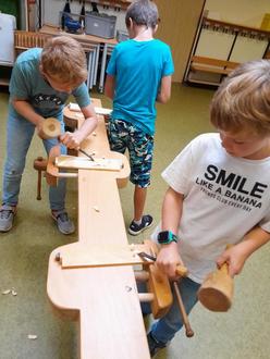 Mit Energie, Elan und einer gehörigen Portion Ehrgeiz waren die Kinder dabei, arbeiteten fleißig und konzentriert und gingen so in Ihrer Arbeit auf, dass die Eltern noch eine ganze Weile auf ihre Kinder warten mussten, da sie ihre Kunstwerke noch zu ihrer vollen Zufriedenheit fertig stellen wollten. Einige Eltern waren genauso neugierig wie ihre Kinder, sodass sie ebenfalls ein wenig mit anpacken durften und einen kleinen Crash-Kurs von ihren Kindern im richtigen Umgang mit dem Holz erhielten. Die Ergebnisse am Ende waren wirklich toll und einzigartig und alle hatten sehr viel Freude und Spaß bei dem Projekt.