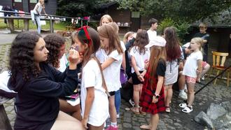 Nach einer Stärkung am Lagerfeuer mit Bratwurst, Grillkäse, Salaten und Schwenkbraten wurden nicht nur die Kinder von unserem Betreuerteam gekonnt geschminkt und die mitgebrachten T-Shirts farblich gestaltet. Raimund hatte u.a. bunte Brillen mitgebracht, die von den Kindern gerne genutzt wurden um das persönliche Outfit noch aufzupeppen.