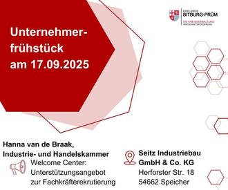Das nächste Unternehmerfrühstück findet am Dienstag, den 17.09.2025 bei der Seitz Industriebau GmbH & Co. KG in Speicher statt. Hanna van de Braak von der Industrie- und Handelskammer Trier wird das Welcome Center vorstellen. Das Ziel des Welcome Centers ist es, internationale Fachkräfte und Unternehmen in der Region Trier zu unterstützen. Als Unterstützungsangebot für Unternehmen und internationale Fachkräfte dient es der umfassenden Beratung und Information, um den Einstieg und die Integration in den deutschen Arbeitsmarkt zu erleichtern.