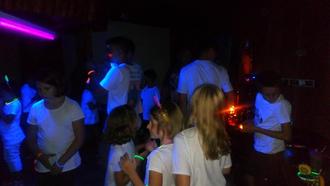 Die mitgebrachten weißen T-Shirts und die geschminkten Kinder und Betreuer/innen kamen im abgedunkelten Raum bei floureszierendem Licht klasse zur Geltung. Bei fetziger Discomusik, leckeren (alkoholfreien) Cocktails und Knabbereien war die Party ein voller Erfolg und alle waren begeistert.