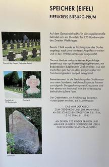 Sie erklärt die Symbolik und die Bedeutung von Kriegsgräberstätten ebenso wie die kunsthistorischen und denkmalpflegerischen Aspekte der Anlagen. Eine Vorstellung der wichtigsten Friedhöfe in Rheinland-Pfalz, einschließlich der in und um Speicher rundet die Ausstellung ab.