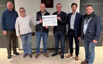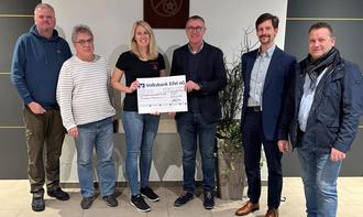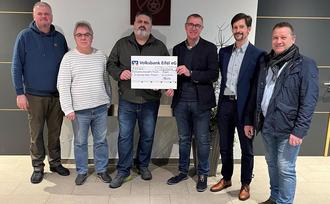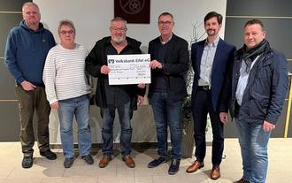 Das Bild zeigt die Übergabe an die Jugendgruppe Preist. Zu sehen sind v.l.n.r. der 1. Beigeordnete Stefan Willwerding, Ortsbürgermeister Dr. Edgar Haubrich, Vorsitzender der Jugendgruppe Sascha Hogen, Vorstand der Photovoltaik Projekte Preist AöR Hans-Peter Schmitz, Aufsichtsratsmitglied Stefan Krein und stellvertretender Vorstand Achim Peters.