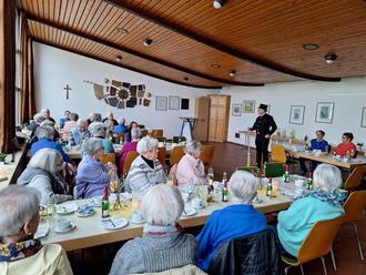 Zu Beginn des Seniorennachmittags begrüßte ich die Teilnehmenden und blickte kurz auf das vergangene Jahr zurück. Außerdem überreichte ich Maria Zenner im Namen der Ortsgemeinde einen Blumenstrauß, da sie im letzten Jahr nach vielen Jahren als Organisatorin und Helferin offiziell aus dem Helferinnenteam des Seniorennachmittags ausgeschieden war. Aufgrund eines krankheitsbedingten Ausfalls unterstützte sie uns an diesem Nachmittag jedoch noch einmal.