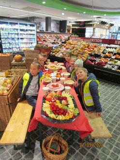 Am 21.9.2022 durften wir Vorschulkinder, im Rahmen unserer Vorschulprojekte, den REWE besuchen. Dort hat uns Herr Hasenstab empfangen und uns in die Obst- und Gemüseabteilung begleitet. Dort stand ein gedeckter Tisch mit lauter köstlichen und auch gesunden Snacks. Das Team vom REWE hatte für uns tolle Platten mit Obst, Gemüse mit Dip, Fleischwurst, Käse, Brötchen und Kekse vorbereitet, von denen wir zuerst naschen konnten. Dazu gab es auch noch Getränke.