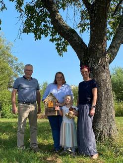 Alois Gerten, Ortsbürgermeister, Annika van der Heyde, Vorsitzende Förderverein, Tanja Feltes, Kita-Leiterin, und ein „kleiner Honiglecker“ bei der Übergabe der Insektenhotels.