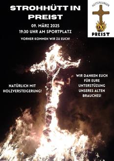 Die Preister Hüttenjungen veranstalten wieder den traditionellen Brauch des Hüttenbrennens. Die Strohhütte wird um 19:30 Uhr entzündet. Im Anschluss findet die Holzversteigerung statt. Ich bitte die Dorfbevölkerung um einen regen Besuch.