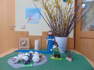 Zum Einstieg ins Osterprojekt hörten wir in diesem Jahr das Gleichnis „Der gute Hirte und das verlorene Schaf“. Jesus machte mit diesem Gleichnis deutlich, dass Gott genau wie der gute Hirte niemanden alleine lässt. Und dass die Kinder und alle Menschen sich immer auf Gott verlassen können.