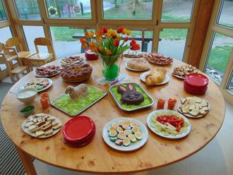 Der Höhepunkt der Osterzeit sind die Osterfeier mit schönen Osterliedern, und das tolle Osterfrühstück an Gründonnerstag. Auch in diesem Jahr kam der Osterhase vorbeigehoppelt um uns schöne Osterhasentütchen zu bringen.